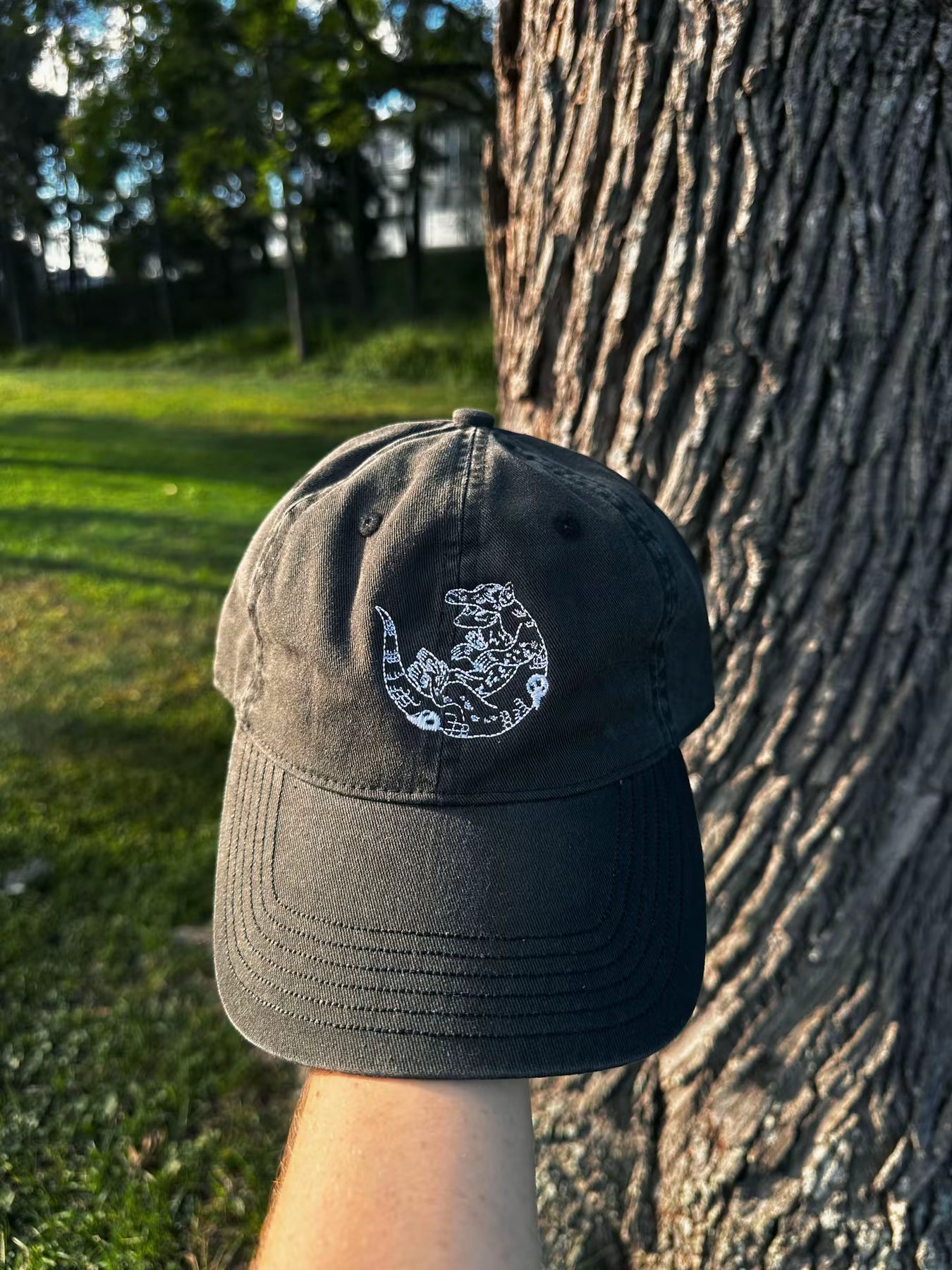 The Grey Grace Collection cap features the Dreamlike Visions creature design, drawn from a meditation on “the fall”, a vulnerable moment of longing for deep connection. Intertwined forms merge into a single presence, symbolising intimacy, acceptance, and the human desire to be truly seen. The ouroboros-like creature loops endlessly, reflecting unity and transformation